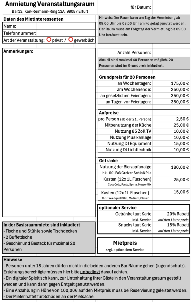 Unser gemütlicher Veranstaltungsraum bietet den perfekten Rahmen für Eure Feierlichkeiten. Er ist voll ausgestattet mit professioneller Veranstaltungstechnik, DJ-Equipment, Soundanlage und Lichttechnik.